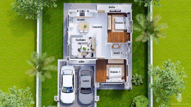You can access the living room from the carport through sliding glass doors. With an average size floor plan, the living spaces occupy the left side of the plan. On the other hand, the right section hosts the two bedrooms and a bathroom in between them. A small service area at the back serves as a support for kitchen activities. Meanwhile, the two-car garage sits on a comfortable spot at the left front corner of the house.