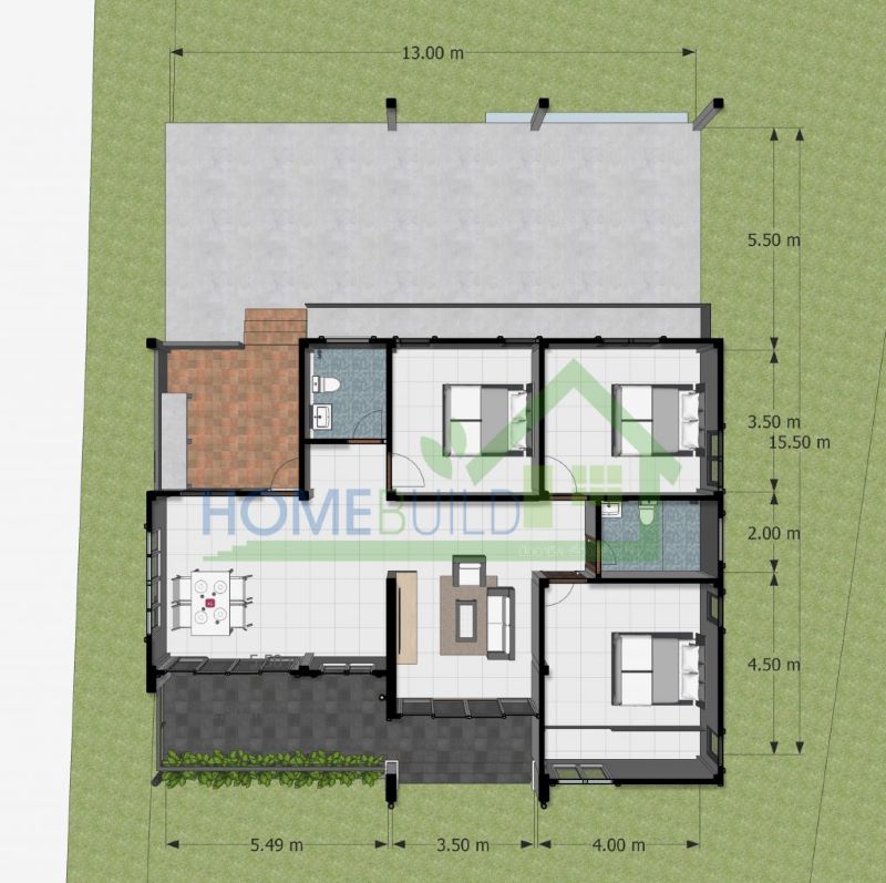 The house in feature has a frontage of 13.0 meters and a length of 15.50 meters. It yields a usable building space of approximately 200.0 sq, meters with a terrace of 71.0 sq meters. The space hosts a verandah, living room, dining area, kitchen, three bedrooms, two bathrooms, and a back terrace.