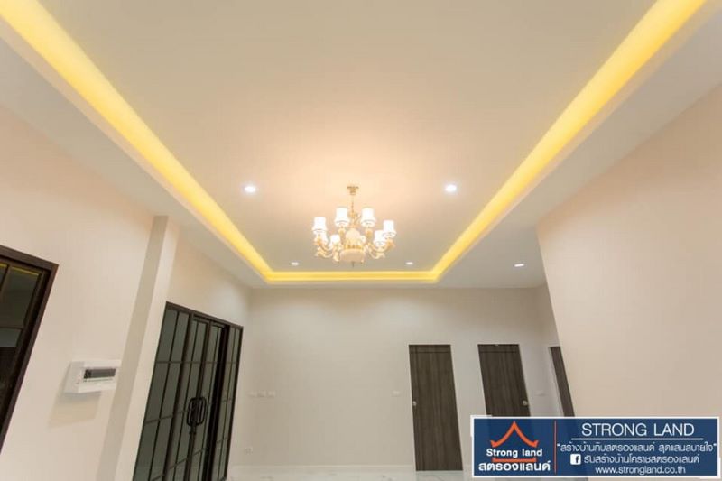 The recessed ceilings with a chandelier and perimeter lighting make the great room of the inner spaces gleam in brightness and along with comfort create a conducive interior.