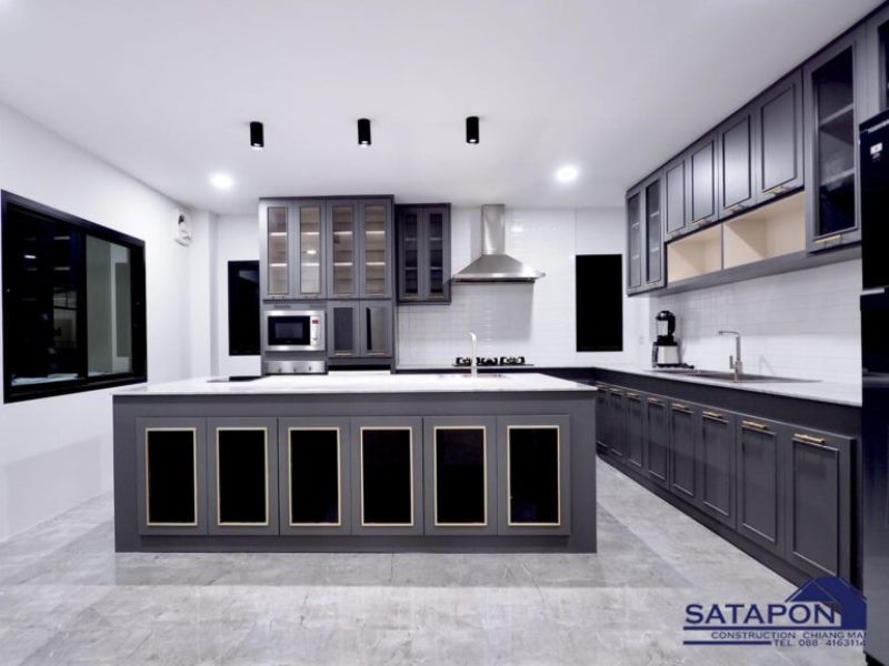 Meanwhile, this island kitchen is nothing but very modern and elegant, from materials, fixtures, layout, and workmanship. It is very spacious and decorated in white, grey, and black tones. Likewise, it is equipped with the most complete functions, including a long L-shaped counter, an island counter, built-in electric stove, hood, and plenty of storage cabinets as well.