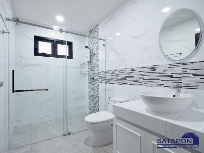 The bathrooms are as elegant as the other rooms of the house. They shine brilliantly with marble floor and wall tiles and genuine fixtures in white and black colors.