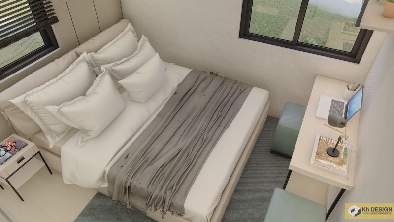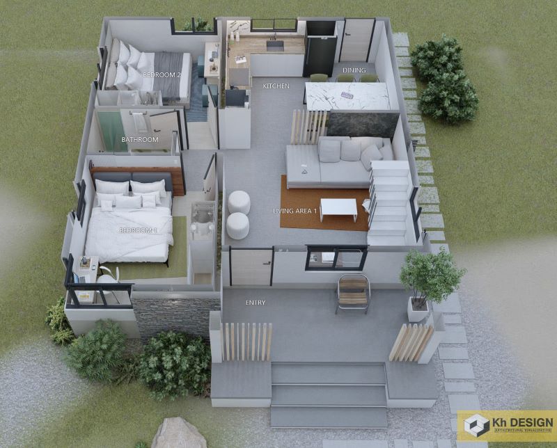 The interior space is accessible from the terrace through sliding glass doors. Directly ahead of you lies an incredible great room that is airy and bright as tons of natural light and air penetrates through the glass. The living spaces are on the right section, while the private zone of two bedrooms occupy the left section of the plan. The living room flows perfectly into the dining room and kitchen. The small internal space, setting, and arrangement offers a smart accessibility and mobility between rooms.