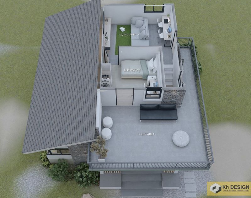 Meanwhile, the upper level hosts the family room and one bedroom. The balcony accessible from the bedroom is a great place to relax and see the outside panoramic view of the outdoor living space.