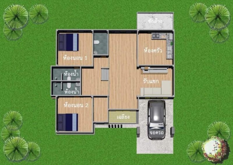 The design features a terrace that makes your way to access the living spaces through glass doors. The entire floor has two major sections, the living spaces occupy the right side, while the private zone of two bedrooms and a bathroom settle on the left portion of the layout. Meanwhile, the carport finds its comfortable spot on the right corner of the house.