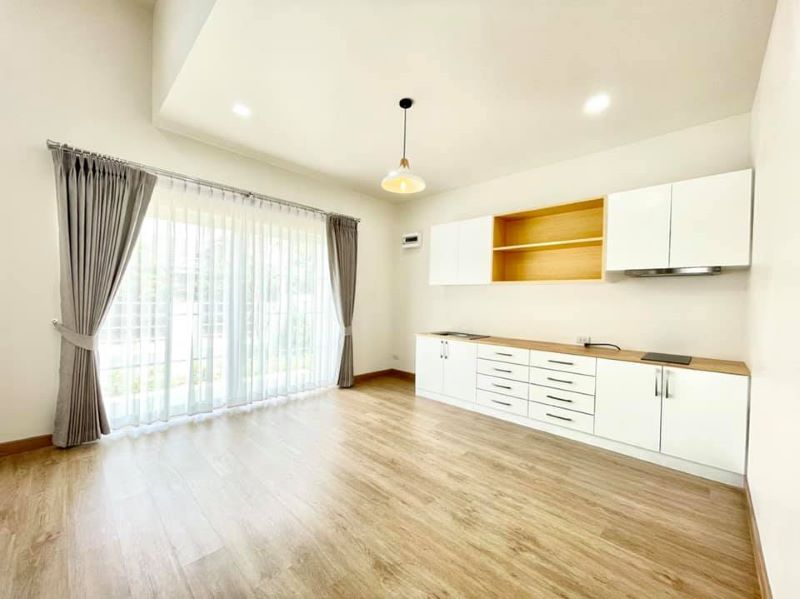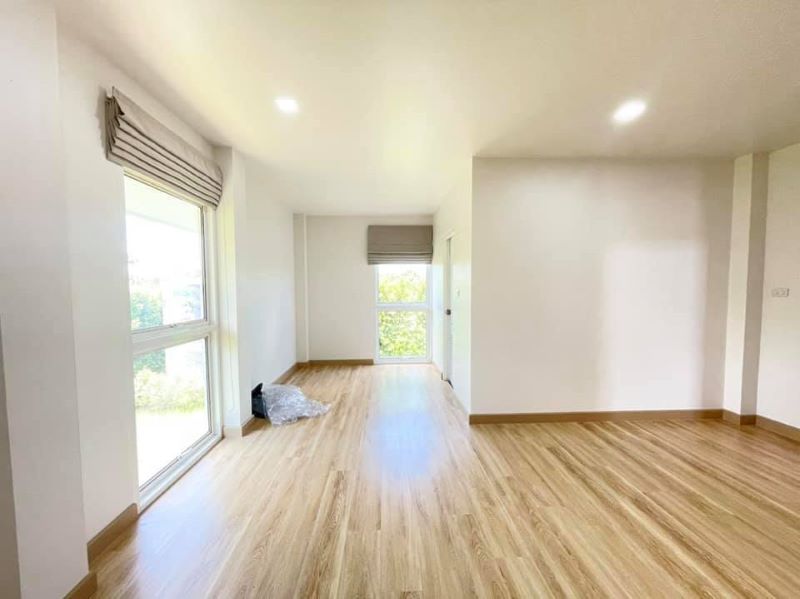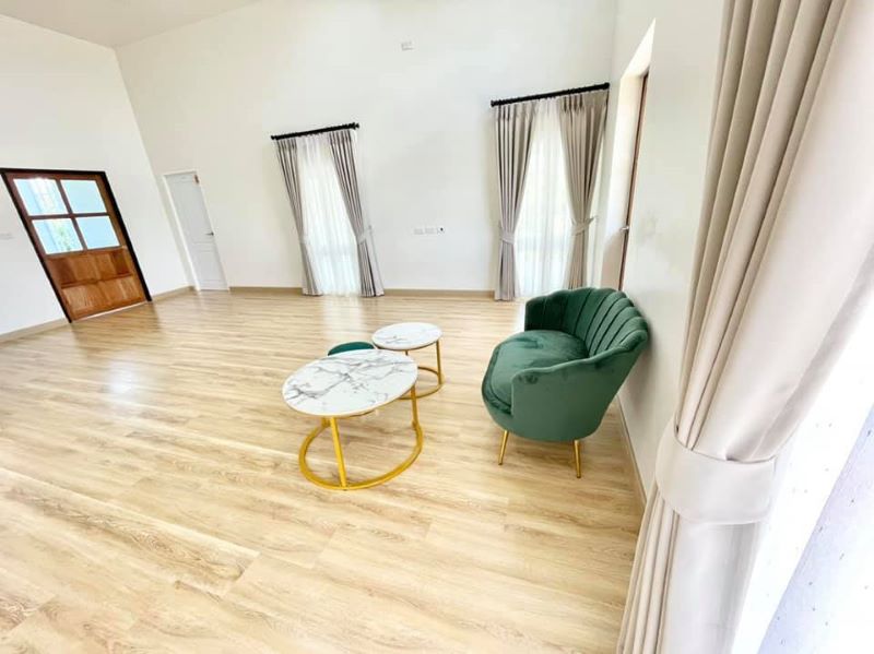 The mix of furniture and accessories blends with contemporary designs including the curtains and decorations. As can be seen, the workmanship from the floor with wood patterned rubber tiles, to the walls and ceilings in creamy white paint is incredibly attractive.