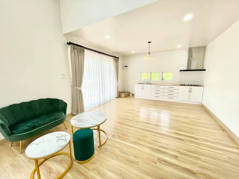 The mix of furniture and accessories blends with contemporary designs including the curtains and decorations. As can be seen, the workmanship from the floor with wood patterned rubber tiles, to the walls and ceilings in creamy white paint is incredibly attractive.