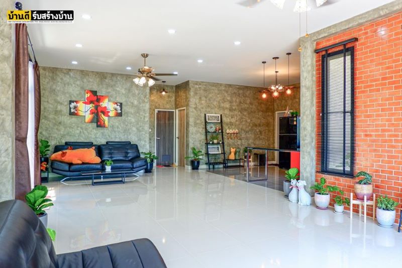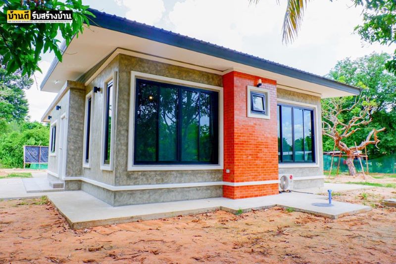 Meanwhile, the rear elevation delivers a striking character with a prominent rectangular pillar with accents of orange natural bricks. Besides, just like the other elevations, this faced blow with large glass windows that adds comfort to the inside.