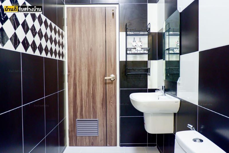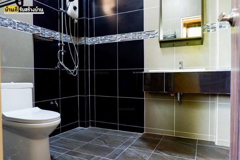 The bathroom looks very stylish and artistic with various types of tiles utilized from grey on the floor and black on the walls. The space is very elegant and definitely, using this will be satisfactory.