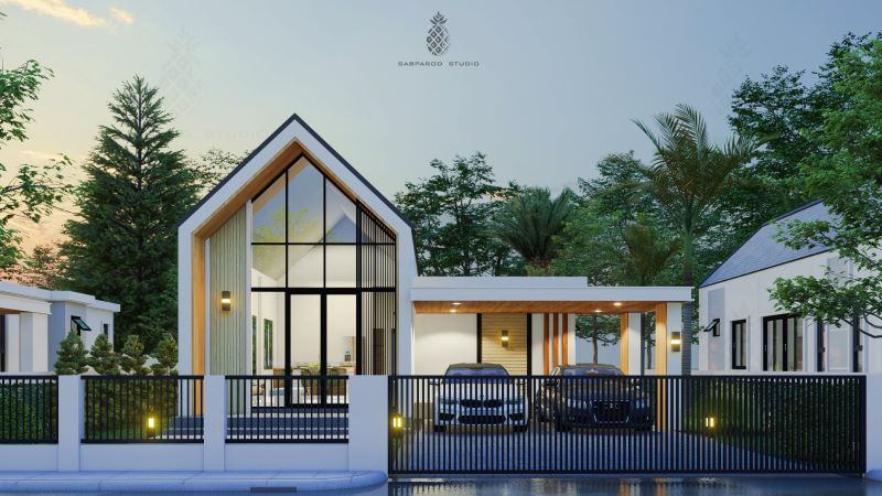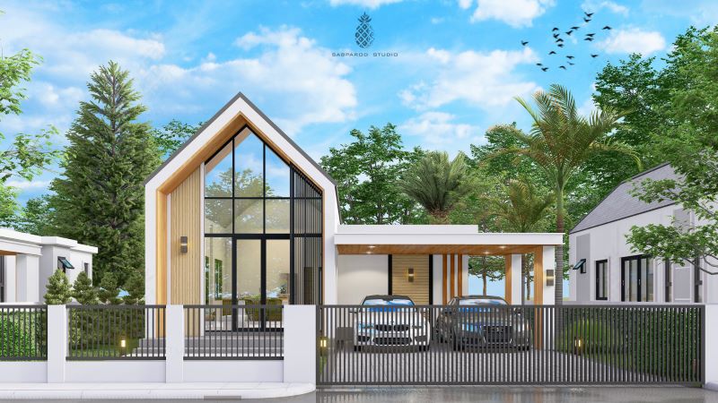 Certainly, this house has one of the most eye-catching designs. The house features a carport that accommodates two cars with brown-colored natural stones in the back wall, columns, and an elegant flat roof with wood paneling and lights. The concept creates more of an outdoor room than just a spot to park a car.