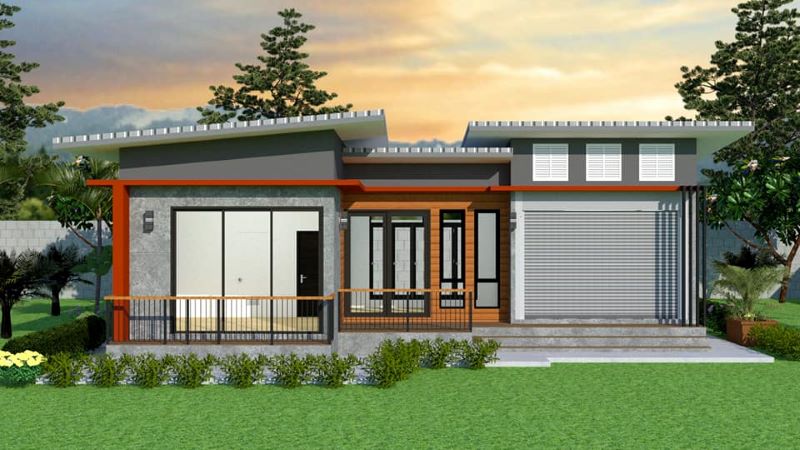 This beautiful design makes living in the countryside easier with peace, privacy, and flexibility to be enjoyed. By the way, this design will also be a great house for an urban community. In the first place, this design will stand smart in any housing location. The dominant grey shade mixed with an accent of brown and orange creates a pleasing contrast with the green environment.