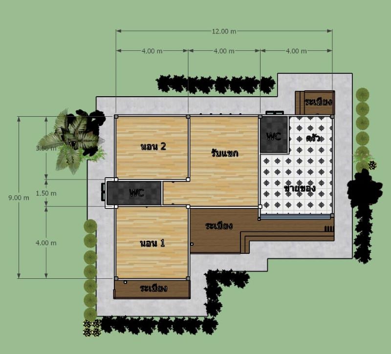 This design boasts great spaces with plenty of natural daylight flooding the common areas of the house. The unit stands in a lot that measures 12.0 x 9.0 meters and yields a usable space of 100.0 sq. Correspondingly, the floor plan hosts a terrace, balcony, living room, dining room, kitchen, two bedrooms, two bathrooms, and business space.