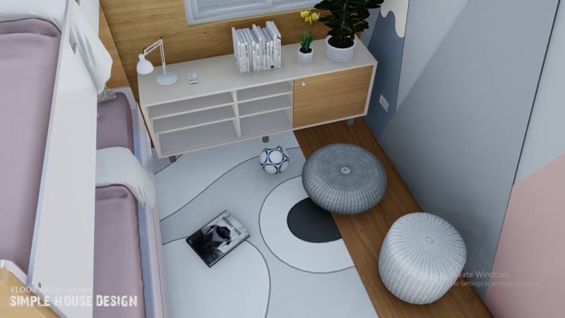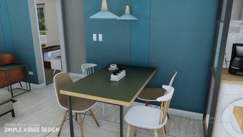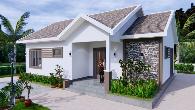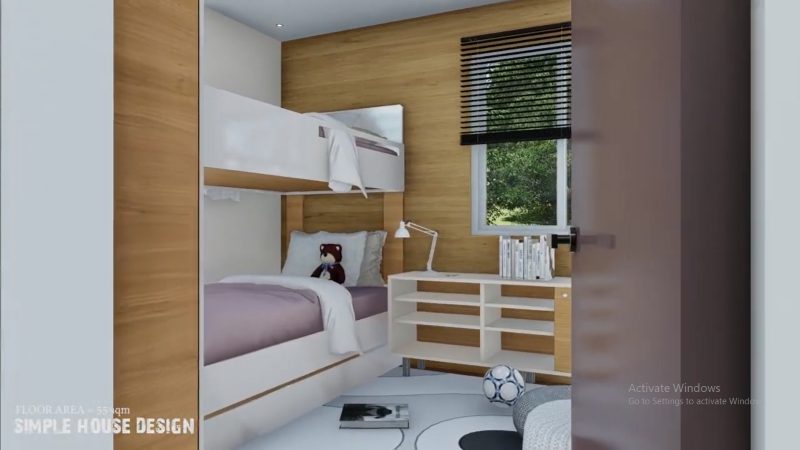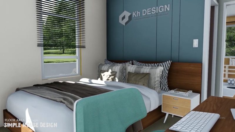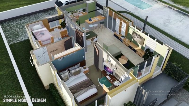 Th design has a very compact and straightforward but functional design. The living spaces occupy the right side, while the left section hosts the private zone of two bedrooms. The lone bathroom sits between the two bedrooms. The interior space is complete with furniture and amenities serving the entire family.