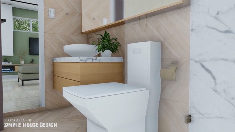 With a lot dimension of 6.5 x 9.2 meters that yields a floor area of 55.0 sq, meters, this design is best for a small family. The usable space hosts a porch, terrace, living room, dining area, kitchen, two bedrooms, and one bathroom.