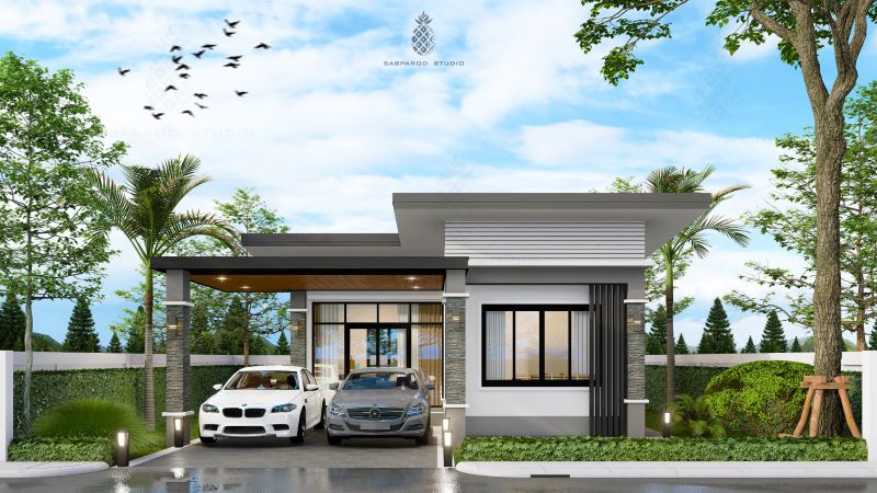 The design features a small porch that serves as an entrance to the living spaces. It also offers wall cladding with natural stone accents on the front and left elevations creating a stylish exterior aesthetic.