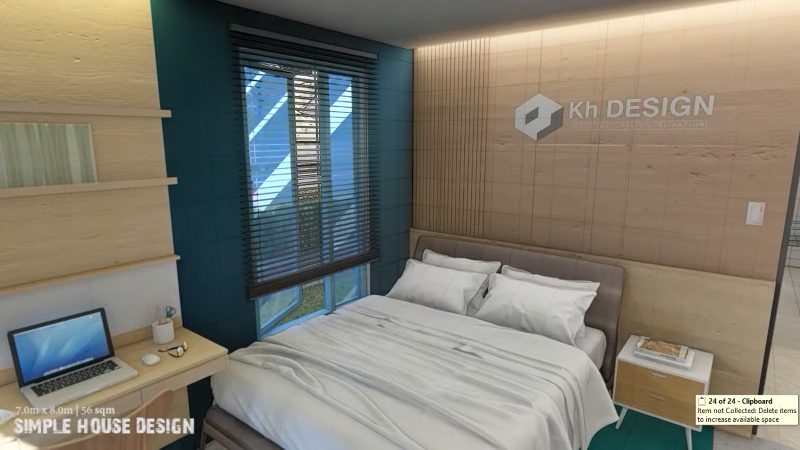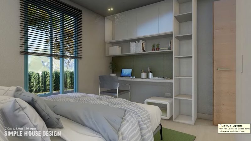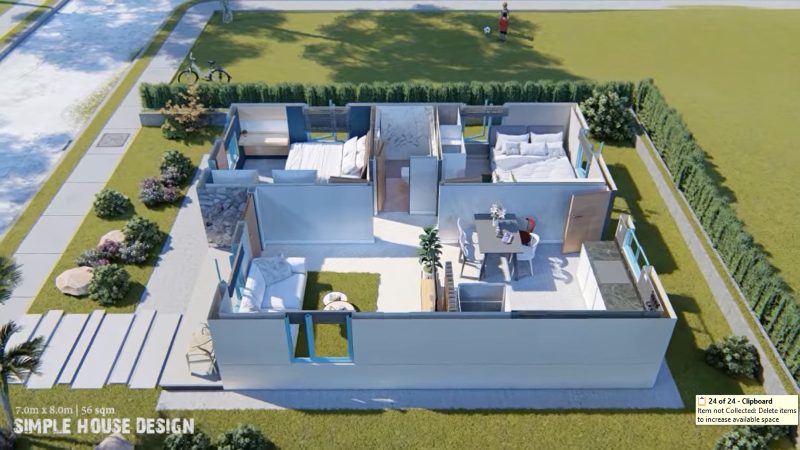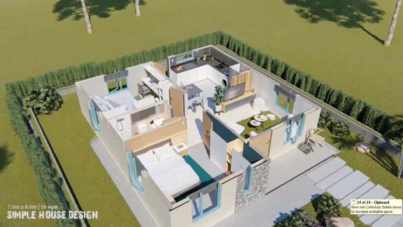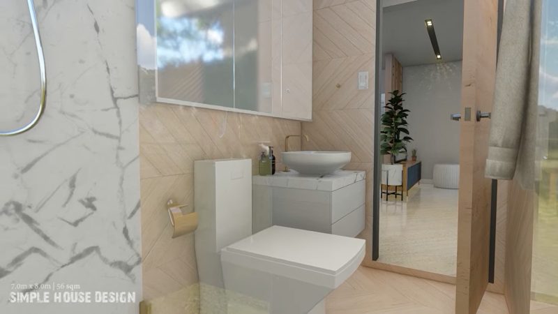 This house plan stands in a lot that measures 7.0 x 8.0.0 meters that yields a usable building space of 56.0 sq. meters. A small floor area hosts a small porch, living room, dining room, kitchen, two bedrooms, one bathroom.