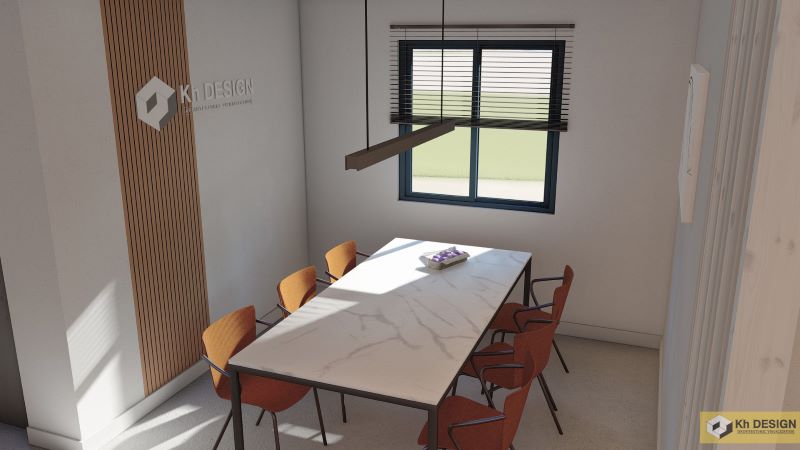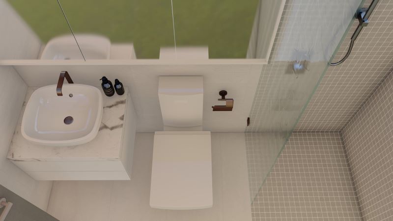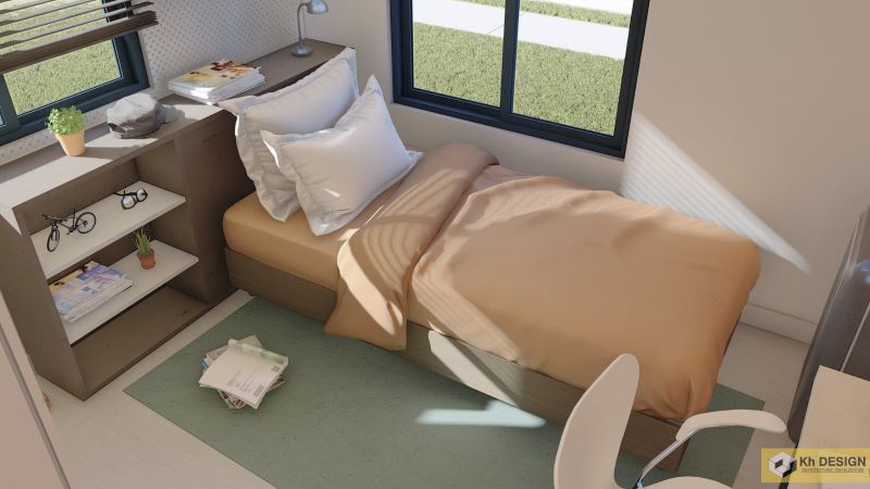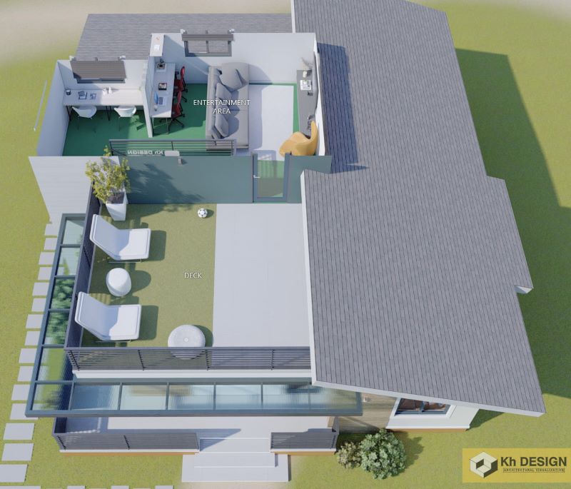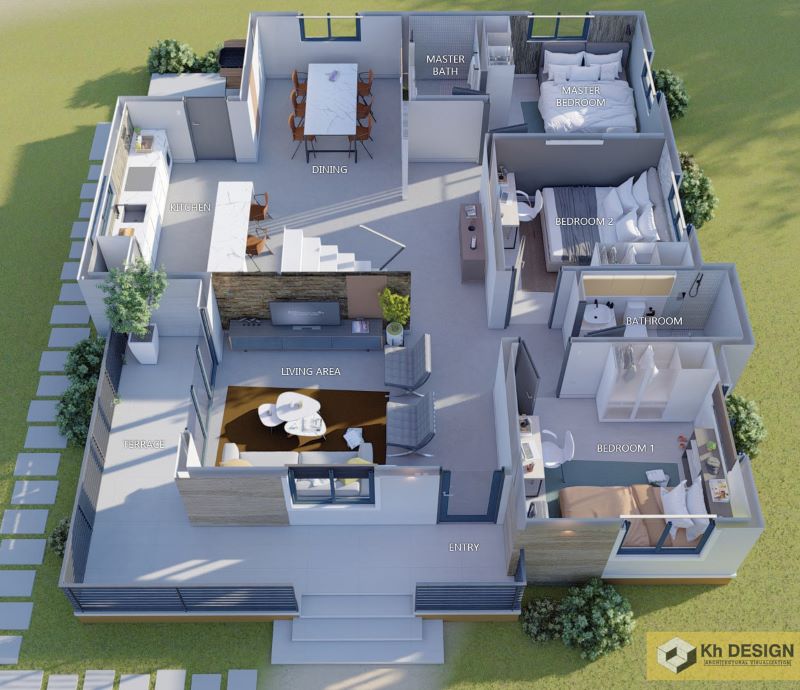 A very functional layout, the entry L-shaped terraced will bring you the living room through a glass door. The living spaces occupy the left section of the plan in a free-flowing concept. On the other hand, the right side hosts the private zone of three bedrooms. The master’s bedroom with a private ensuite sits on the back corner, while the secondary bedrooms are on the front right. The common bathroom sits in between the secondary bedrooms.