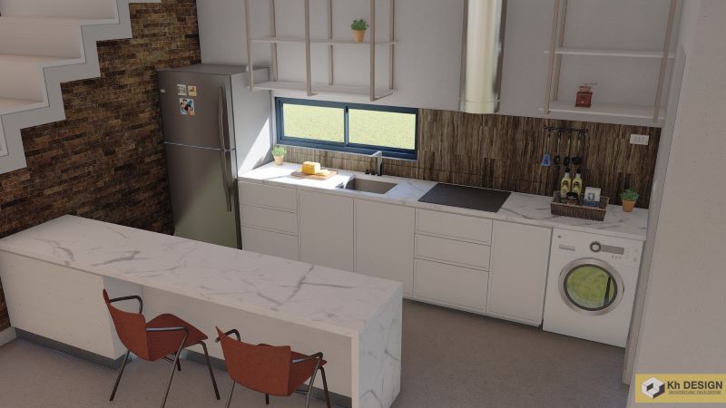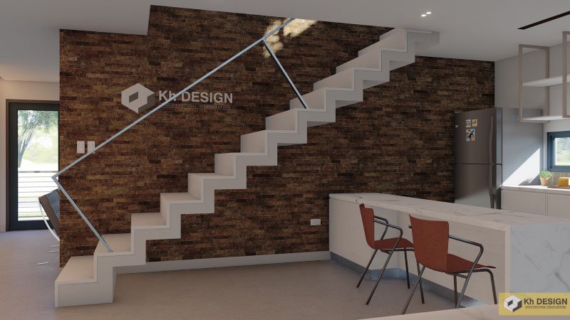 The concept of consistency extends to the modern kitchen with a bar counter. The cream-colored countertop and cabinets establish a contrasting dynamic appeal with the wall accented by natural sandstones.