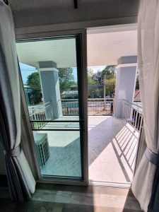 A balcony seen from and accessible from the master suite via framed sliding glass doors
