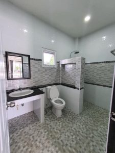 A well-designed bathroom in white and grey accents that equally gleams with elegance as the other rooms.