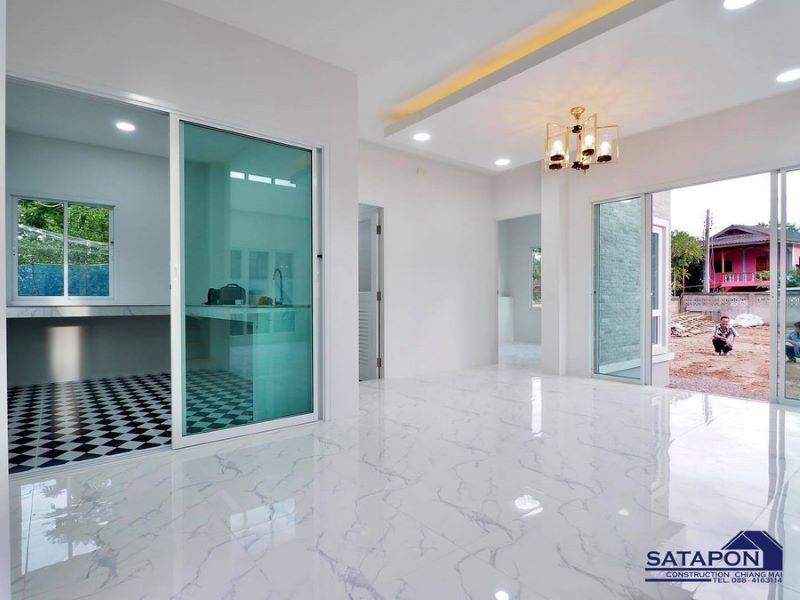 Another excellent feature of this design is the prominent cross hip roof assembly with a white ceiling. The roof truss in wooden prefabrication system is covered with ceramic tiles in grey color.