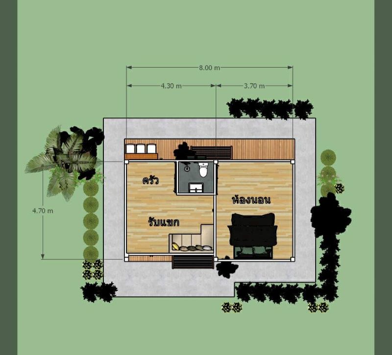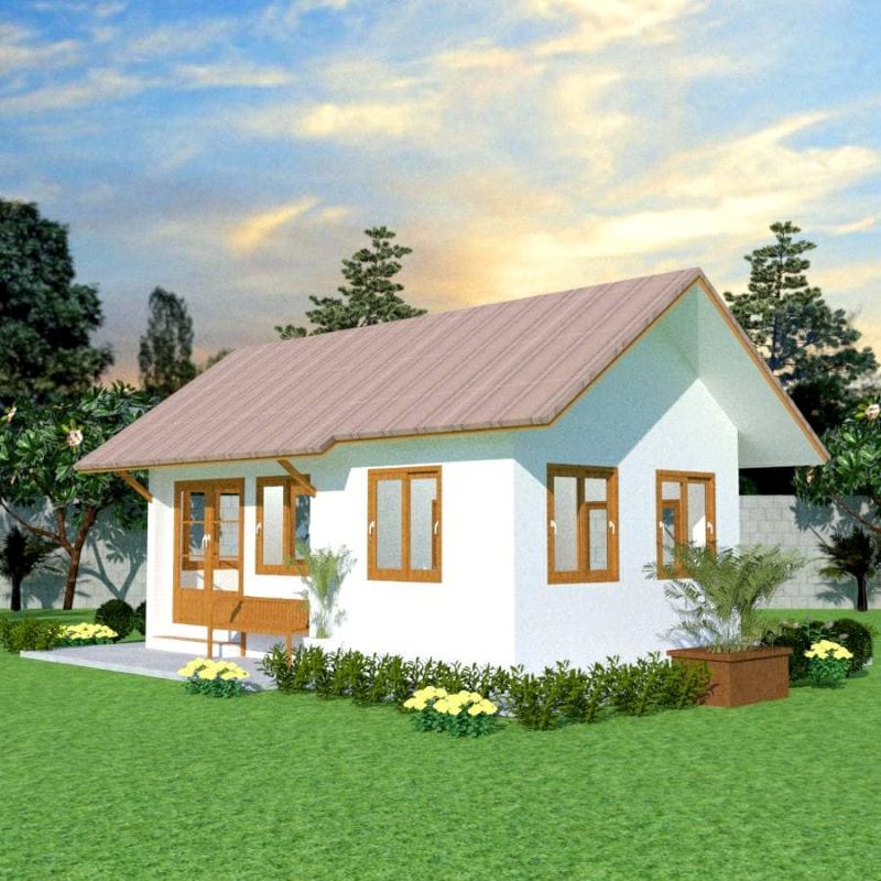 A compact design, you will see the combined living spaces and the bathroom on the left side of the layout. On the other hand, the lone bedroom for the entire family occupies the right side of the plan. Meanwhile, there is wooden seating in front and on the balcony at the back which is very functional as an extension of the inner spaces for relaxation