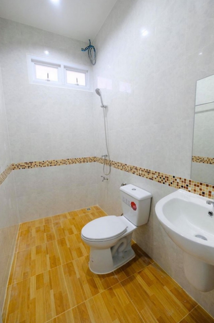 - e T&B: the flooring with brown parquet tiles while the wall has white tiles decorated with mosaic patterns