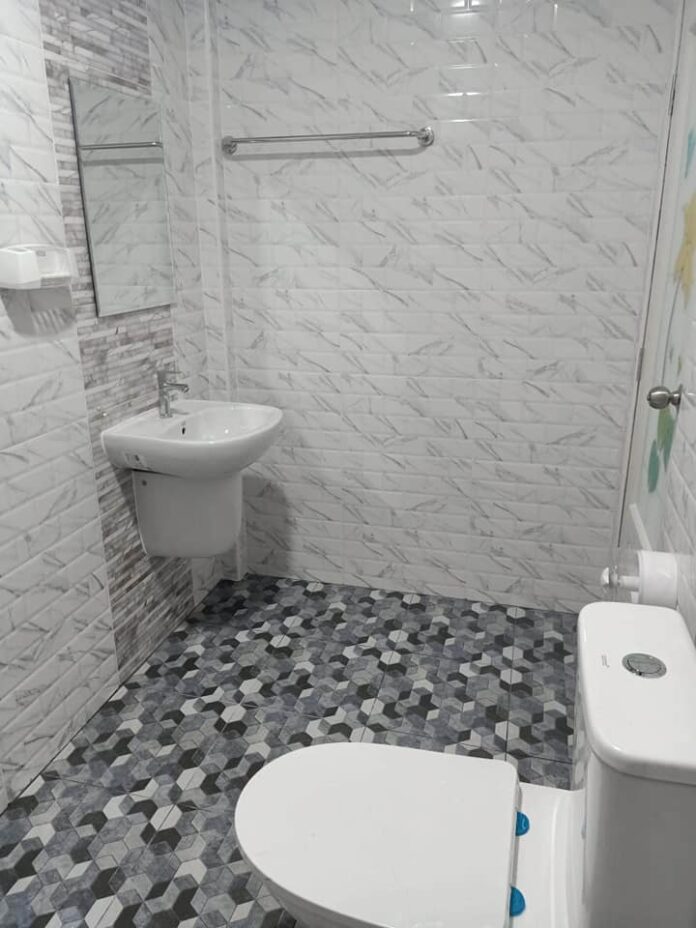 The bathroom although small exudes grace with grey-colored floor and wall tiles.