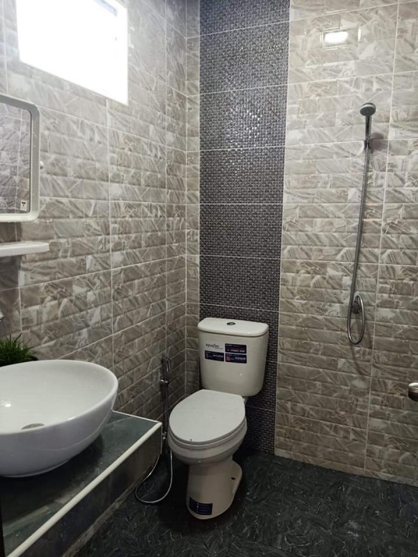 Elsewhere, the bathroom gleams in its own design – with grey floor tiles and dark grey and light brown wall finish. The accessories are obviously genuine and are of good quality.