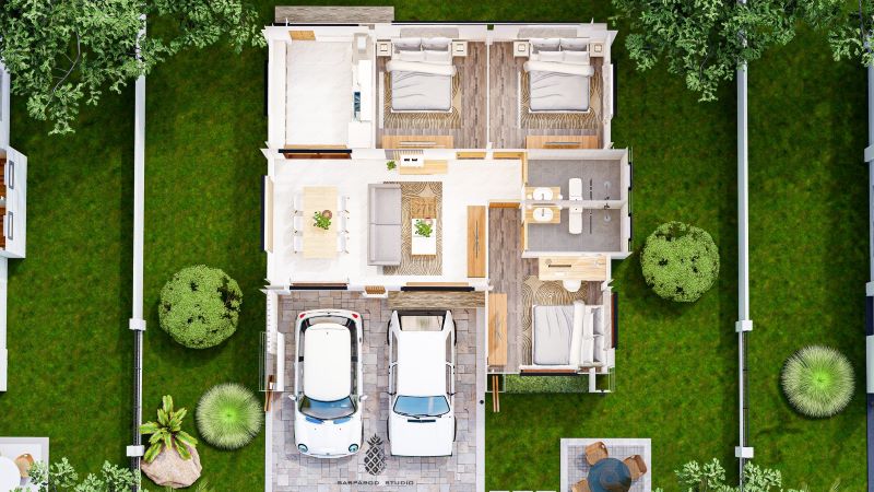 The flow of the inner space creates an easy enjoyable lifestyle with the living spaces positioned at left section of the plan. The dining room and kitchen that enjoy a free-flowing concept sit on the left of the living room. Also, the living room is bordered by three bedrooms on the right and front. The master suite with a private ensuite occupies the front corner, while the secondary bedrooms sit side by side at the back.