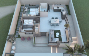 You’ll appreciate the separation of the internal rooms. The living spaces occupy the right section, while the entire left side hosts the private zone of two bedrooms. Everyone will be drawn together to enjoy the comfort of the great living area, dining, and all the pleasures of the kitchen which is the perfect hub for the family to share sumptuous meals any time of the day.