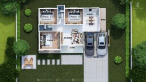 A straightforward interior layout with well-zoned spaces is designed to maximize space, privacy, and enjoyment. A lot that measures 15.50 x 9.0 meters yields a usable building space of 145.0 sq. meters. The area spreads to a porch, living room, dining area, kitchen, three bedrooms, two bathrooms, and a two-car garage.