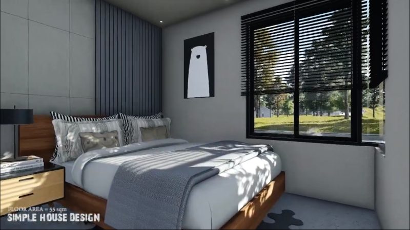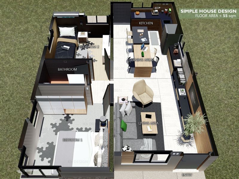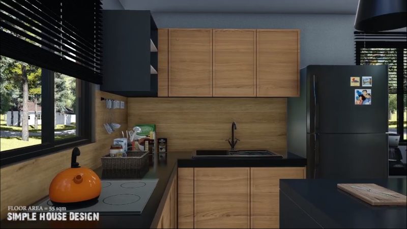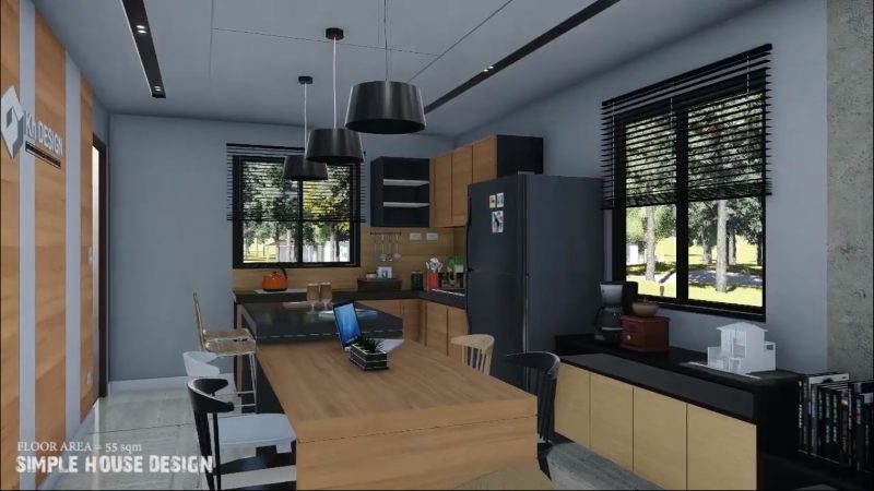 This home with a floor area of 55.0 sq. meters is perfect for a small family. The floor area spreads to a porch, living room, dining area and kitchen, two bedrooms, and one bathroom. A straightforward layout, this is the best design that can be planned out of this floor area.