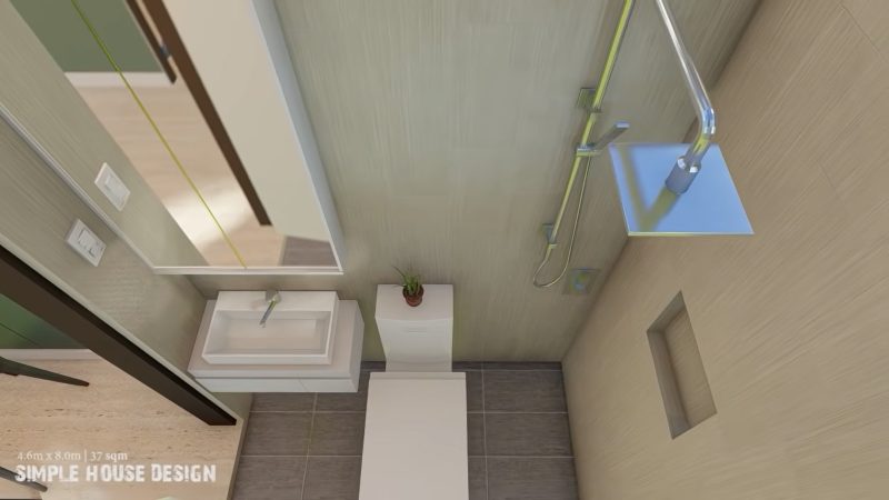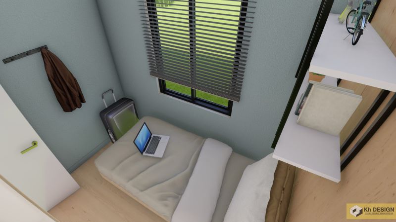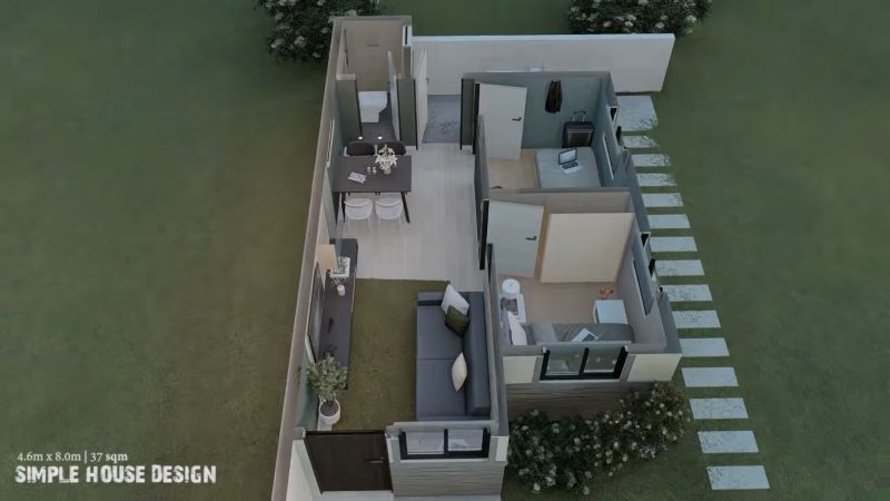 The inner space is accessible through a wooden door. Once inside, you will observe the living spaces on the left side, while the right section hosts the two bedrooms. By the way, the kitchen is located at back due to size limitations. Meanwhile, the lone bathroom sits beside the dining room.