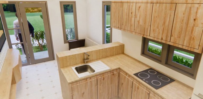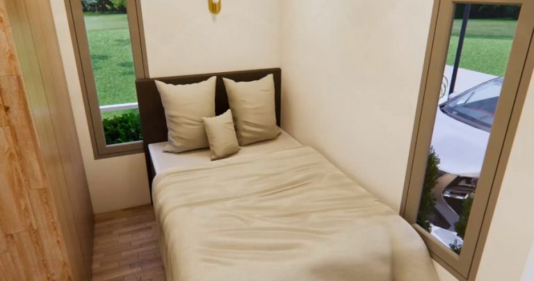 This contemporary tiny home is uniquely styled with creative concepts on the exterior. It features a small porch on the main entrance. The natural marble stone accents and batten pillars combined with glass doors and windows give this house plan a contemporary look. These concepts don’t only secure but beautify the structure. As can be seen, the house in creamy white paint generates a relaxed and inviting atmosphere. Additionally, this design in a soft shade keeps the exterior fascinating.