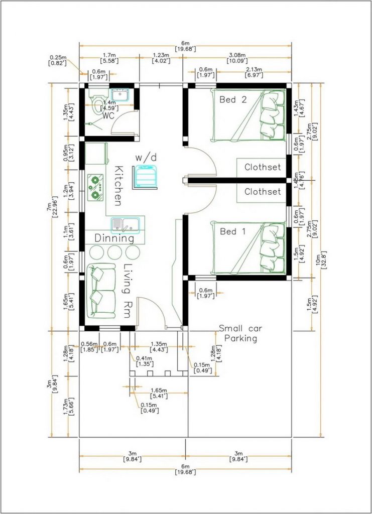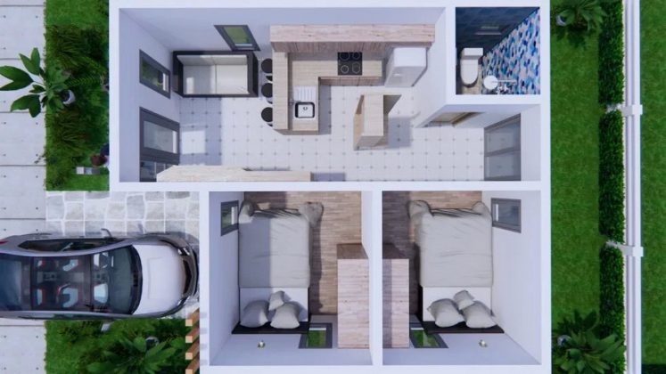This is a compact and straightforward layout. As you enter from the porch, you will observe that the space has two major sections, the living spaces on the left band the private zone of two bedrooms on the right. The living area, dining, and kitchen form a linear layout with the lone bathroom at the end. Meanwhile, there is a small garage on the right corner of the design.