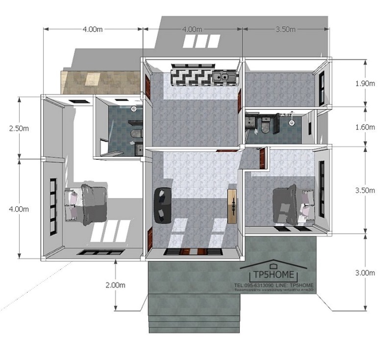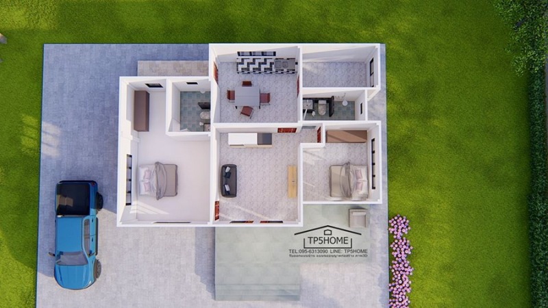 You can access the living room from the terrace through the main glass door. From the living room, you will find the dining room and kitchen right in front. The living spaces that settle in the middle of the plan are flanked by two bedrooms on both sides. The master’s bedroom with a private bathroom sits on the left, while the other settles on the right along with the second bathroom. Meanwhile, the open parking space finds its comfortable spot on the left side of the house.