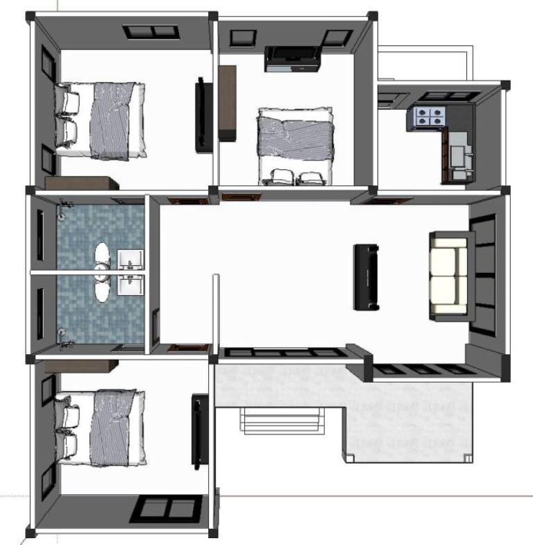 This residence has an open and airy frontage which can serve as an extension for family relaxation. The open terrace leads you to the living room through the glass door. The living spaces occupy the front and right sides of the plan. The dining room is on the left of the living room, while the kitchen is in front. Meanwhile, the bedrooms occupy the left and back sides of the design. The two bedrooms sit side by side between the two bedrooms in the left section of the [plan.