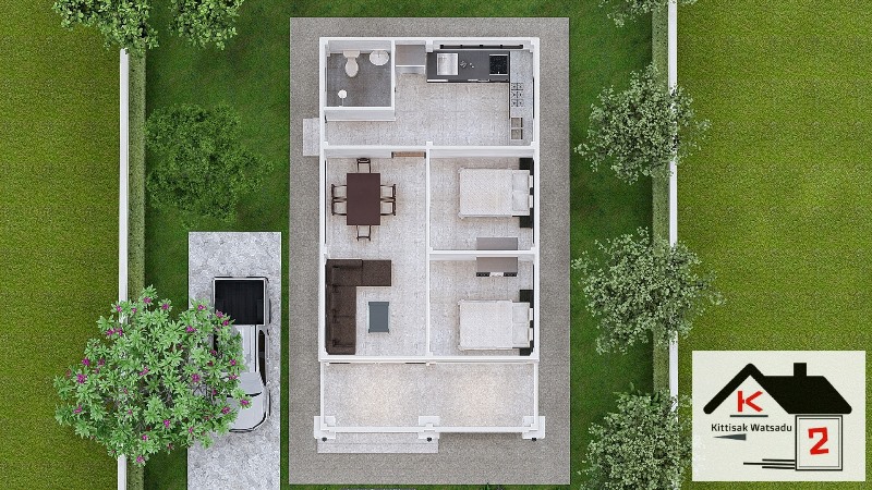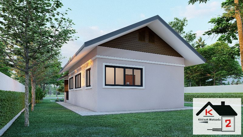 This design with spacious landscaping around the house has a simple design both in the exterior and interior. It features a compact layout with the following specifications – a balcony, living room, dining room, kitchen, two bedrooms, one bathroom, and a separate open car park.