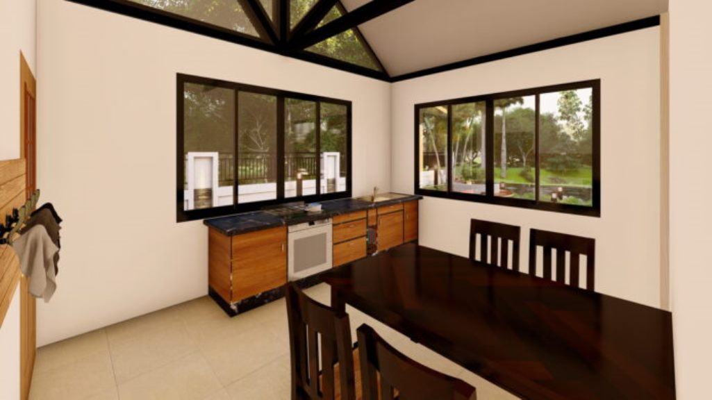 The dining room looks modern with style and is provided with a dark brown wooden dining table and chairs. The small and limited space in the kitchen is enough to let the family easily have access to it while in the living room. Additionally, the space looks very comfortable with enough windows on both sides.