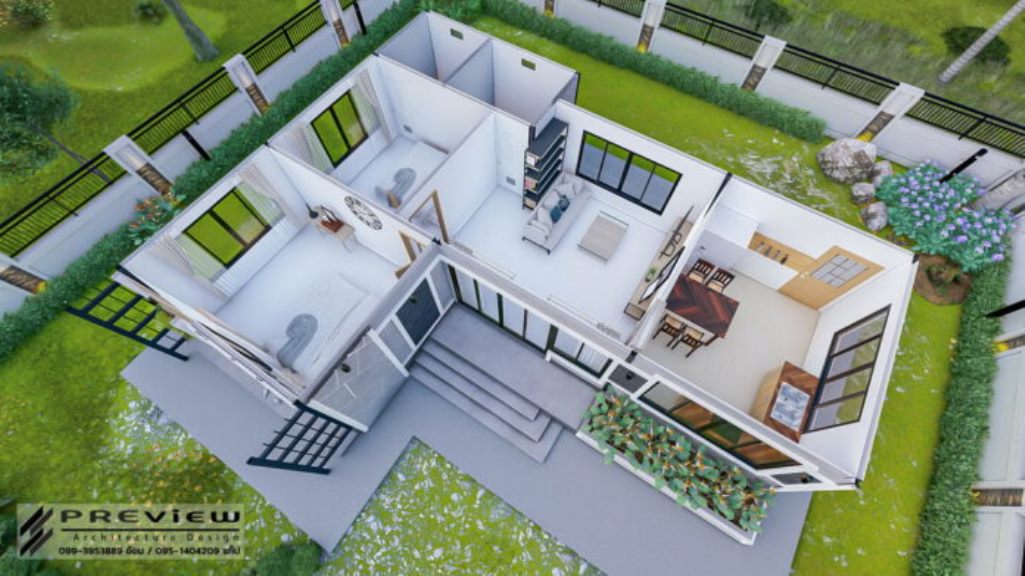The appealing house offers an outstanding appeal beginning right away with the striking entry terrace. From the terrace, you can access the living room through sliding glass doors. It connects to the dining room and kitchen on the right side. The dining room and kitchen are in a limited space but offer the family with complete functions. Meanwhile, the two bedrooms occupy the left portion of the plan which forms an L-shaped concept with the living spaces.