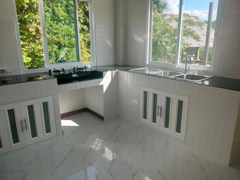 Similarly, the kitchen bears the same concepts as the living room. It bursts with similar floor tiles and walls. It looks very modern and impressive with grey countertops and white-painted cabinets. Likewise, the space is very comfortable with big windows supplying enough air and light for ventilation.