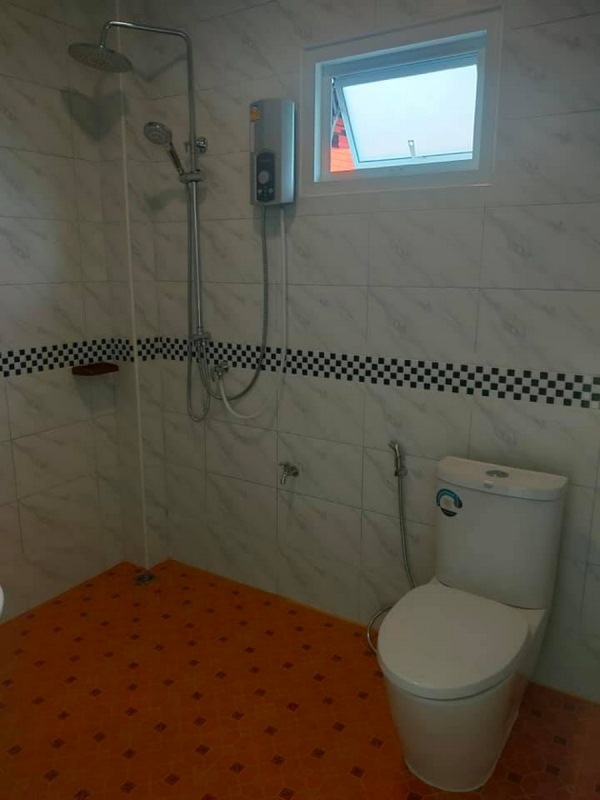 Meanwhile, the bathroom also looks very pleasant in its average space. It is designed with brown-colored floor tiles matched with grey interior wall tiles. The concept though, establishes a consistent appeal and character as the other spaces.