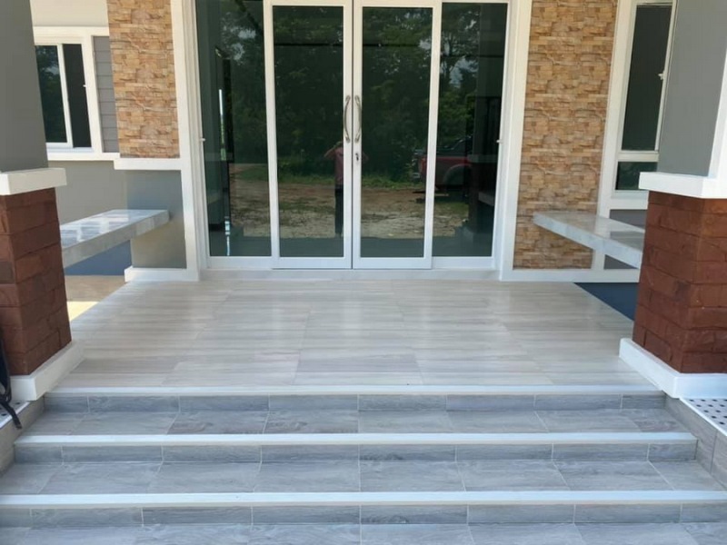 The elevated terrace looks great with grey floor tiles and prominent pillars. This space welcomes you to the living room through hinged glass doors with white aluminum casements.