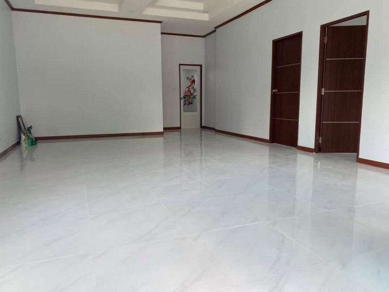 The interior of the house shines with tidiness and grace. The space is designed with grey floor tiles, cream-painted walls, and ceilings. The bottom and top highlights in brown shade offer a little contrast to the room.