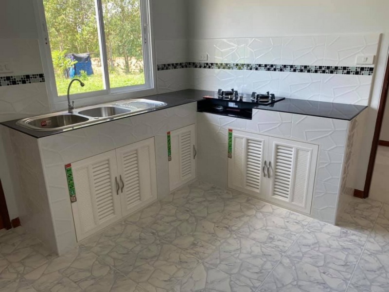 The simple but modern kitchen has similar concepts as the living room. It features the floor with grey-colored tiles with crazy cut design and walls with grey tiles as well. Meanwhile, the kitchen is also provided with a grey countertop and tiles with matching white cabinets.
