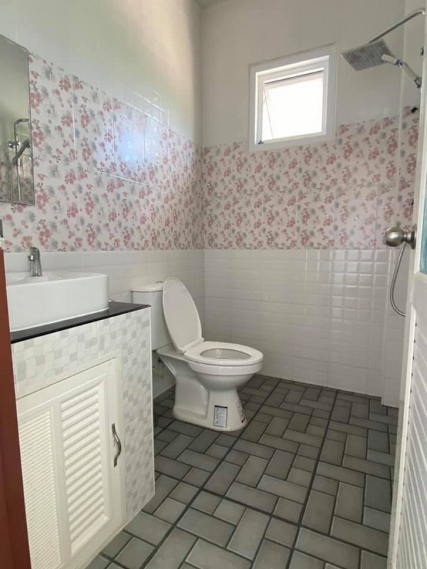 On the other hand, the bathroom has a design of grey floor tiles and white and floral wall tiles. The concepts offer a relaxing atmosphere.