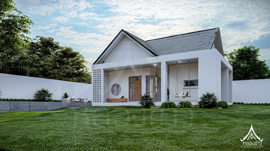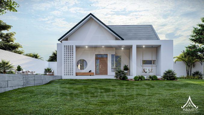 This home design with a Nordic concept has a friendly exterior with an area of 106.77 sq. meters. The usable building space spreads to a verandah, living room, office, dining room, kitchen, four bedrooms, and three bathrooms.