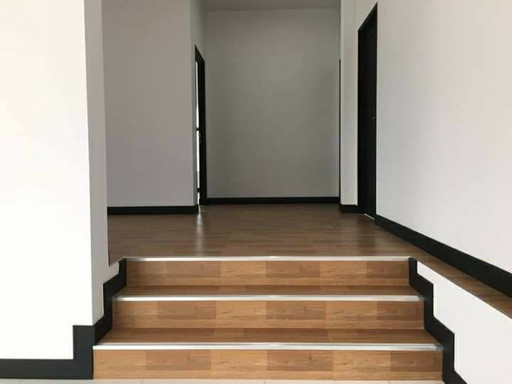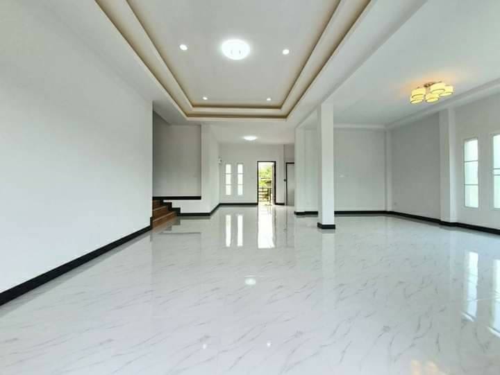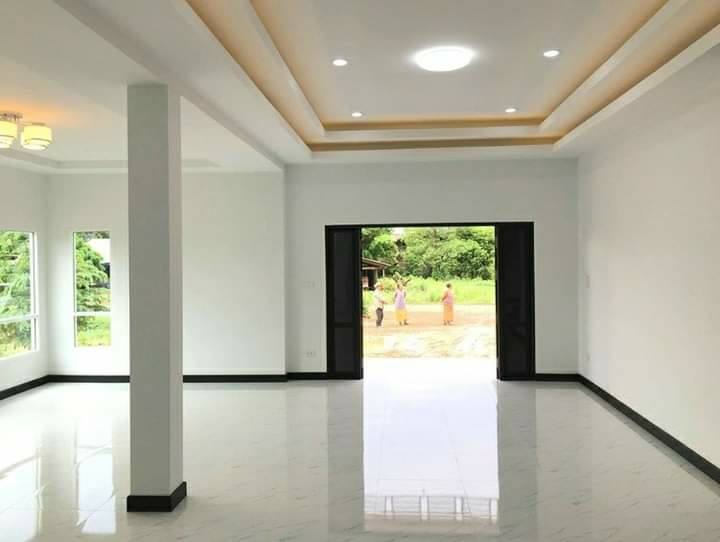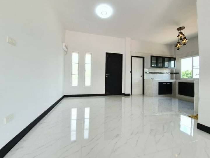 The dining room bursts consistently as the living room with light grey marble floor tiles, cream walls and ceilings.