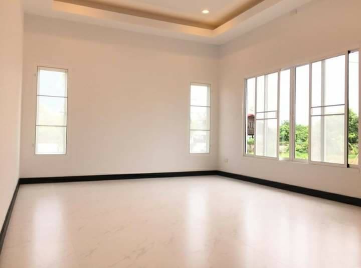 The living room shines in a blend of cream color from floor tiles, interior walls, and ceilings. The space is very comfortable with the provision of large-sized glass doors and windows that allow efficient ventilation to the interior. The recessed ceilings add elegance to the entire living spaces.