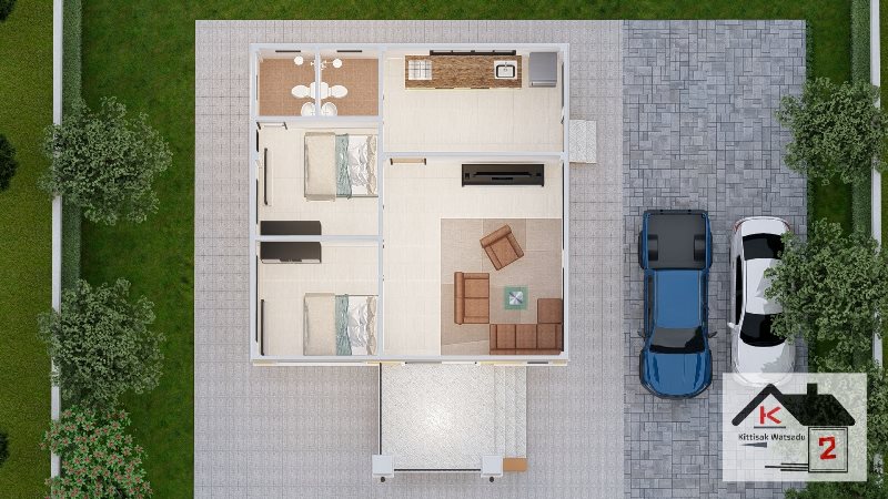 With a closer look at the layout, the fascinating verandah opens to the living area through glass doors which enjoy a free-flowing concept with the dining area and kitchen. This concept delivers better mobility among spaces. On the other hand, the private zone with two bedrooms occupies the left side of the design. There are two bathrooms, one attached to the master’s bedroom and one detached serving the entire family.